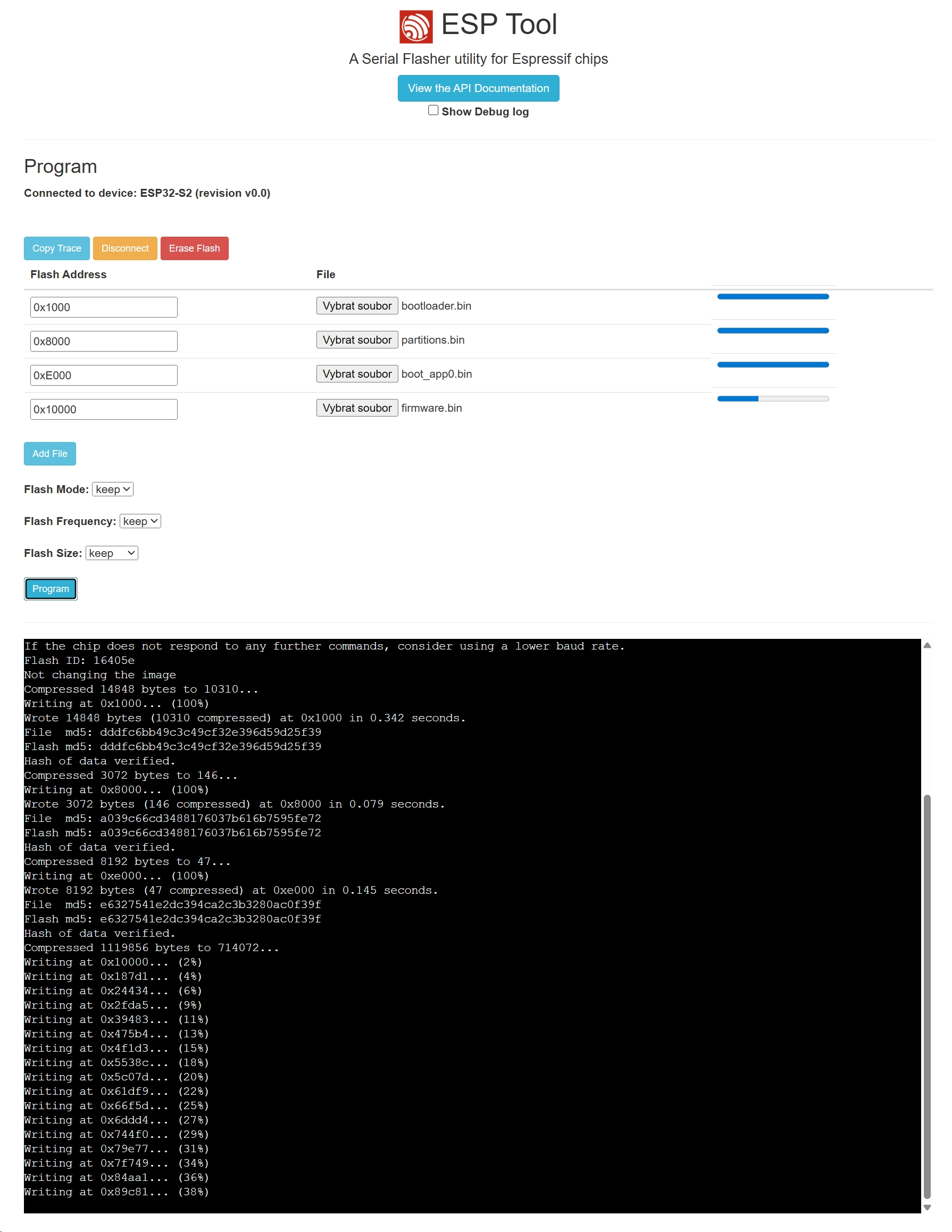 bootloader.bin @ 0x1000 partitions.bin @ 0x8000 boot_app0.bin @ 0xE000 firmware.bin @ 0x10000Nastavení je vidět i na následujícím screenshotu: